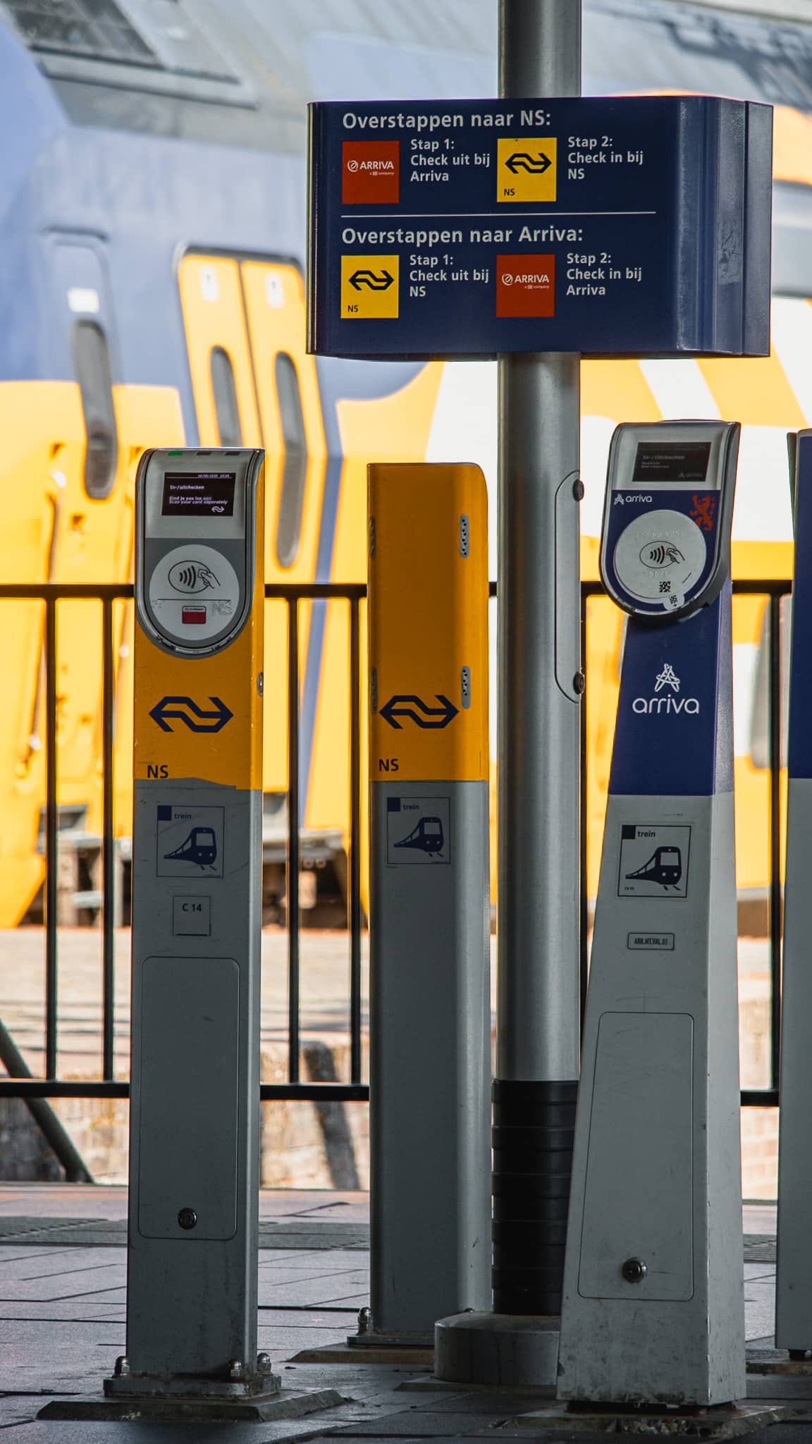 Opgelet! Bij een overstap tussen verschillende vervoerders moet je eerst uitchecken bij het ene vervoersbedrijf en opnieuw inchecken bij het andere, ook wanneer dit tussen twee treinen is. Op die manier krijgt iedere speler een deel van de koek waar het recht op heeft. In de treinstations vind je de zuilen van de verschillende spoorwegmaatschappijen vaak broederlijk naast elkaar op het perron.